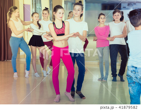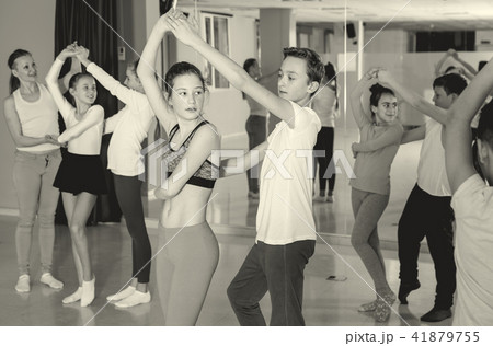 Children dancing rock-and-roll in pairs in choreography class wi