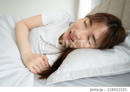 Tired sleeping asian woman grinding her teeth. Bruxism symptoms includes teeth clenching, tooth sensitivity, jaw pain, headaches or neck pain. Oral and dental care concept.