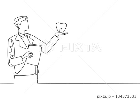 A single line drawing of a man presenting a tooth symbol while holding a folder, illustrating dental awareness and appreciation for National I Love My Dentist Day in a health concept.