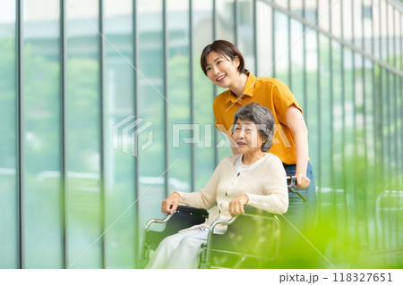 一名坐在輪椅上的老年婦女和一名照顧她的年輕婦女
