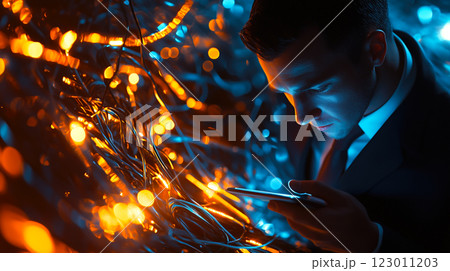 An IT support specialist uses a tablet while working in a server room. The concept of network management, data security, and technology maintenance. Generative AI.