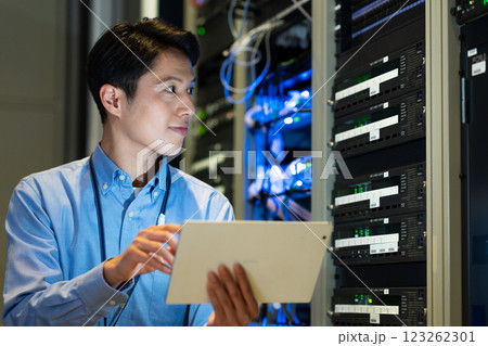 信息系統工作人員在服務器機房檢查計算機信息系統業務形象