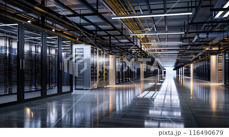 Server room. Server data center. Backup, mining, hosting, mainframe, farm and computer rack with storage information. 3d rendering