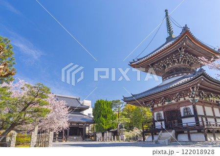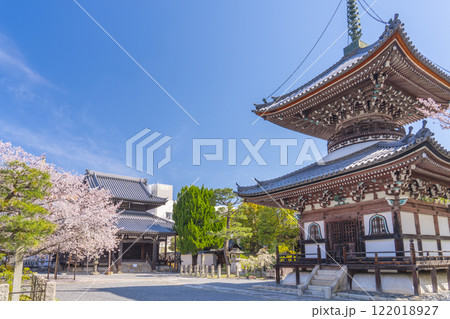 春天的京都,本法寺,櫻花覆蓋的多寶塔
