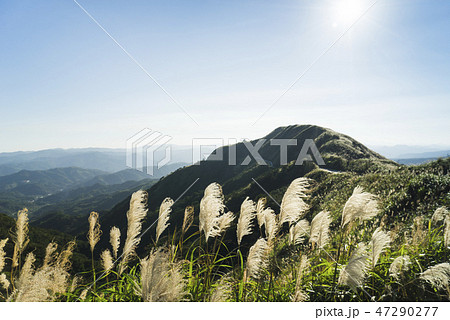台灣新北市九份山上眺望芒草盛開的層疊山巒
