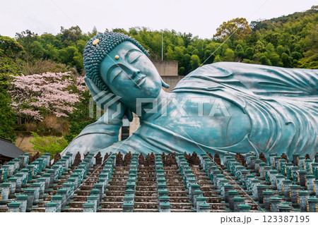 Big reclining Buddha by pink cherry blossom, Sasaguri, Fukuoka
