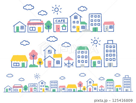 有建築、咖啡館、樹木和雲彩的風景_顏色