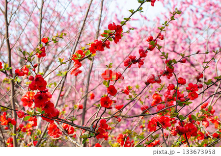 春天百花盛開:櫻花和木瓜花開得正盛。