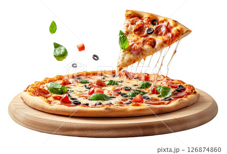 Flying wooden board with pizza isolated on white background png transparent clipart.