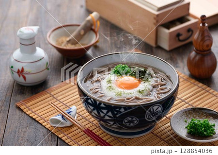 熱氣騰騰的山藥泥蕎麥麵 日式蕎麥麵,配蛋黃和蔥