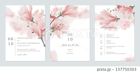 Floral wedding invitation card set template design, pink watercolor decorated with magnolia liliiflora flowerss on white