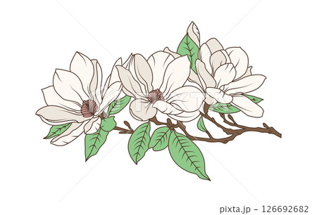Magnolia flower branch with blooming petals and green leaves in vintage botanical line art style, flat hand drawn vector illustration