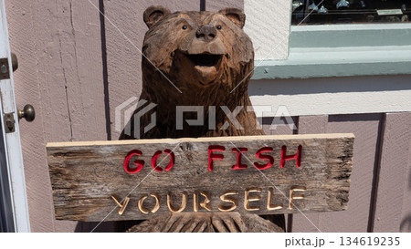 Ketchikan, Alaska, USA - July 26, 2019: Wooden bear sculpture with text on board of Go fish yourself. Wooden bear hold wooden board. Sculpture of wood bear at shop entrance. Text on board