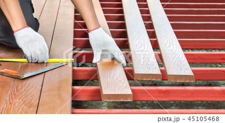 Painting or staining wooden terrace floor. Red brush, close-up.
