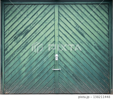 Green wooden gate with diagonal planks and centered handle