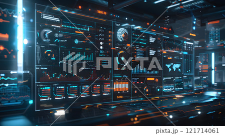 Computer with stock exchange graph on display is in the dark room with neon lighting