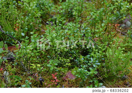 Ripe berries of bilberry grow in forest. Bilberry-bush growing in forest.