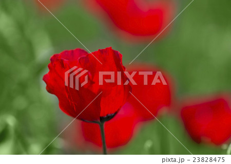 Blooming poppy field in warm evening light. Close up of red poppy flower. Selective focus