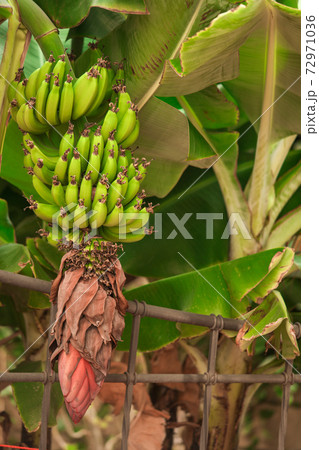Banana tree with bunch of growing green bananas