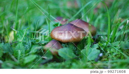 Mushrooms on the green grass in summer morning