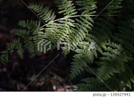 Dappled sunlight filters through a dense canopy, illuminating the intricate, emerald fronds of a fern as they unfurl against a shadowed forest floor.