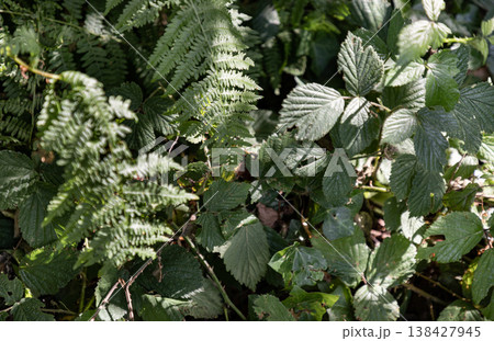 A dense, tangled thicket of emerald ferns and toothed bramble leaves intertwines, showcasing intricate textures in a dramatic play of dappled sunlight and deep shadow, with hints of dry forest debris