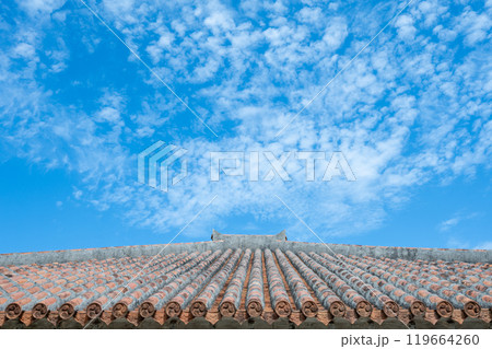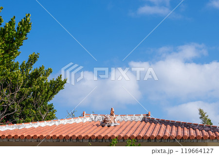 Hisai Okinawa 藍天、紅色木槿和shisa