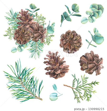 Pine cones with thuja, eucalyptus and spruce branches. Hand drawn watercolor illustration of Christmas botanical elements on isolated background for festive decor, holiday cards or invitations.