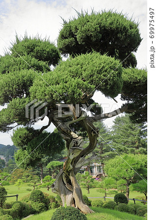 Bansai. Garden with pine tree niwaki. Tree with dense needles and branches.
