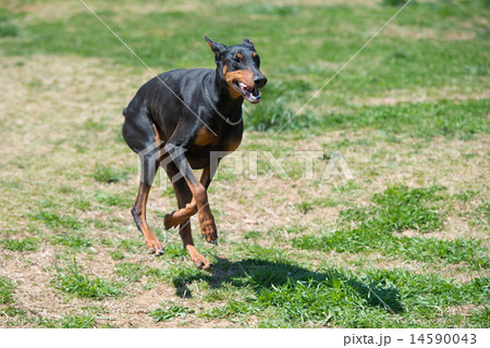 一隻簡單可愛的杜賓犬用皮帶側視的插圖