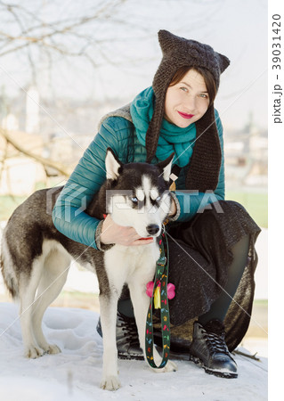 Portrait of stylish woman and her husky pet dog