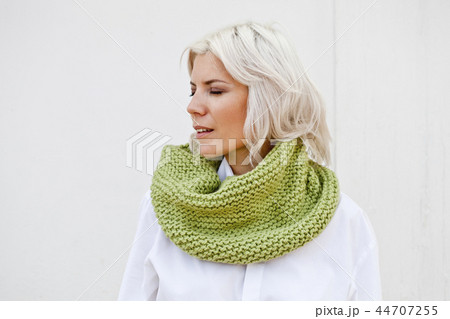 Woman in warm green wool knitted snood.