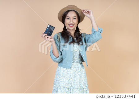 Isolated young Asian woman on white showing mobile screen holiday app features, the woman wearing white suit and straw hat posing with hands on waist and smiling