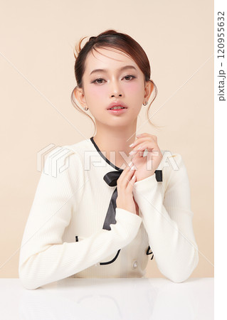 Beautiful young asian woman with clean fresh skin on beige background, Face care, Facial treatment, Cosmetology, beauty and spa, Asian women portrait.