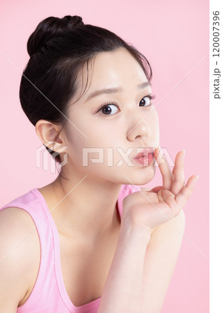 Beautiful young asian woman with clean fresh skin on pink background, Face care, Facial treatment, Cosmetology, beauty and spa, Asian women portrait.