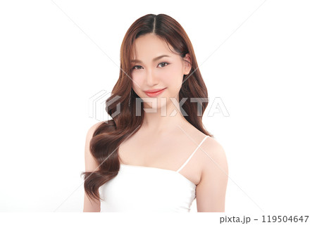 Close-up portrait of young Asian beautiful woman with K-beauty make up style and healthy and perfect skin isolated on white background for skincare commercial product advertising.