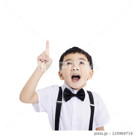 Portrait Thailand kid boy smiling traditional Thai dress costume indicate finger empty space, studio isolated white background, primary child pointing index out with copy space