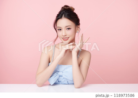 Beautiful young asian woman with clean fresh skin on pink background, Face care, Facial treatment, Cosmetology, beauty and spa, Asian women portrait.