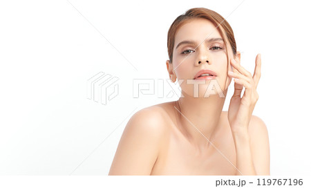 Beautiful young woman with clean fresh skin on white background, Face care, Facial treatment, Cosmetology, beauty and spa, women portrait.