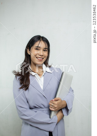 Profile photo of asian working woman hugging her laptop, light purple blue shirt, isolated on white