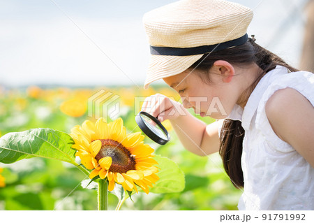 一個用放大鏡看向日葵的女孩