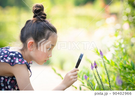 一個女孩用放大鏡看著一隻蜜蜂棲息在一朵花上