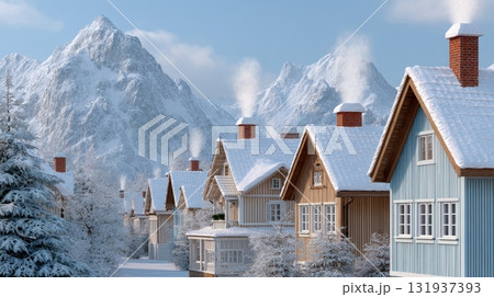 Glowing cottages puffing chimney smoke on hills at night, pine trees, snowflakes, full moon, deer