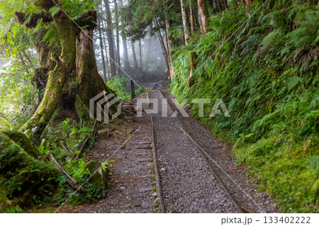 霧氣瀰漫的宜蘭見晴古道與延伸的荒廢鐵軌
