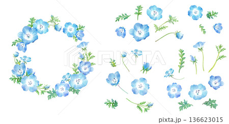 一小束粉蝶花和洋甘菊。水彩插圖。一組組件。