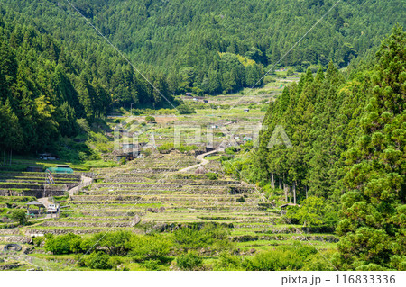 愛知縣新城市四谷的梯田,在晴朗的天空下插秧後