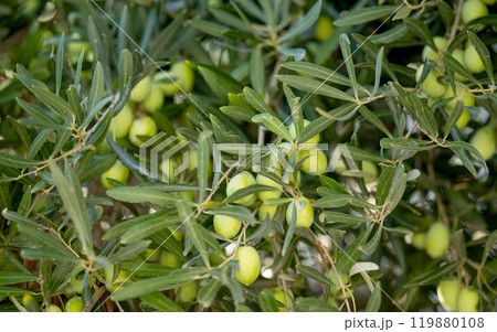 Olive tree with leaves. Harvesting the olives. Picking season for black and green olives.