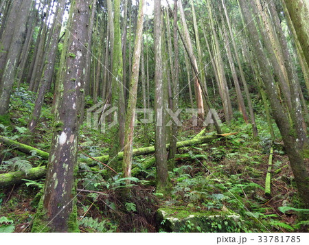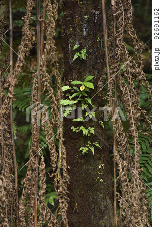 森林裡乾燥的蛇木葉子和生長的植物幼苗