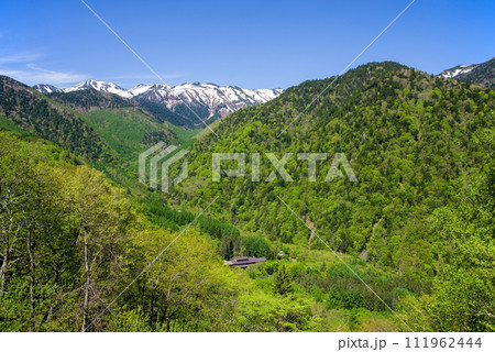 從上高地乘鞍超級林道看到的乘鞍山殘雪和白骨溫泉的新綠