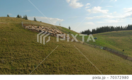 Aerial drone view flight over glade, bright green grass and stone old tower